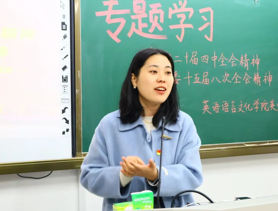 党员吴苏静围绕党的二十届四中全会和省委十五届八次全会精神进行系统解读,重点阐述全会的重大意义、核心目标与实践路径。她结合英语(师范)专业特点,引导大家深刻理解“教育强国”战略与师范生使命担当的紧密联系。