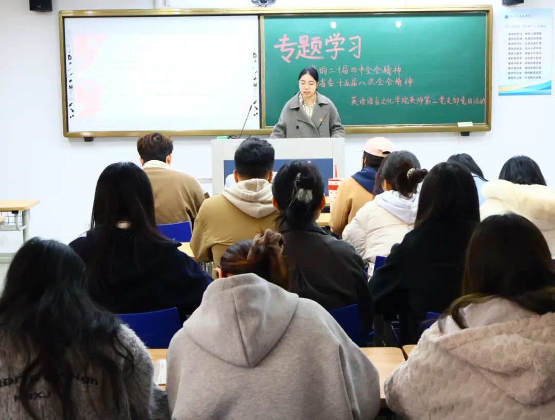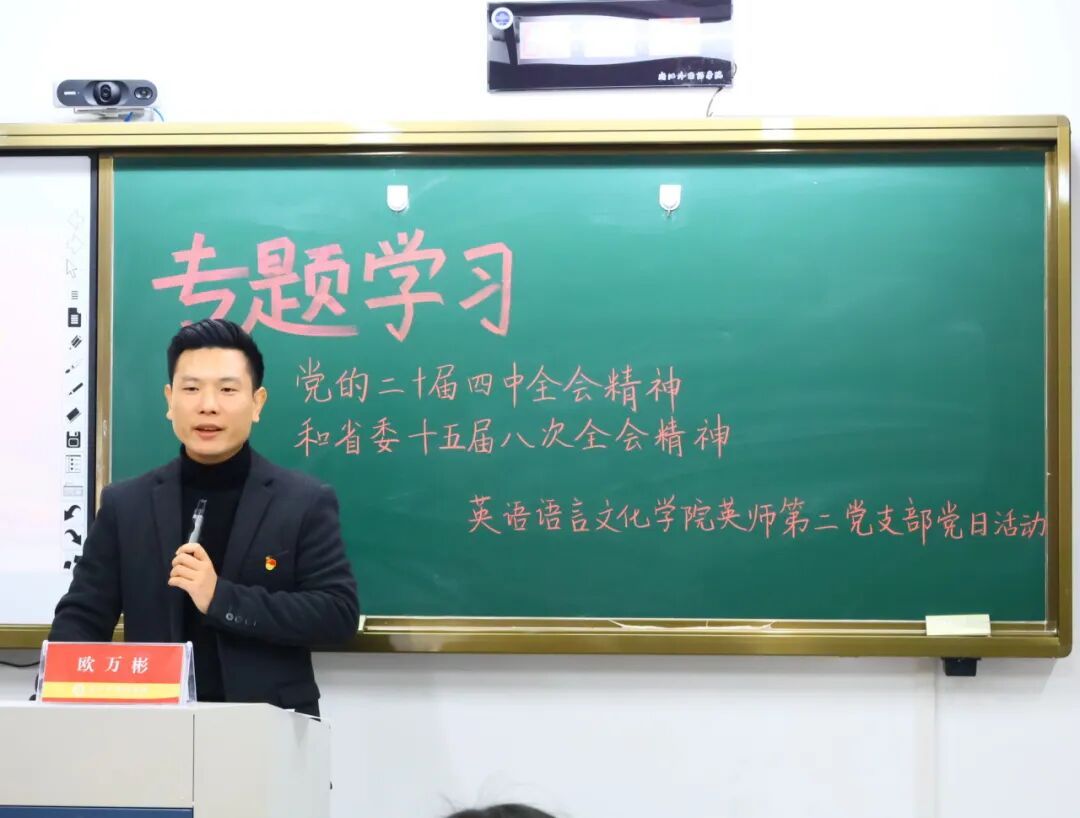 11月27日下午,英文学院英师第二党支部在融A101组织开展主题党日活动,专题学习贯彻党的二十届四中全会和省委十五届八次全会精神。学院党委副书记、纪委书记欧万彬,党支部书记吴小慧与支部全体党员参加学习会,在集体学习与交流中凝聚思想共识、激发奋进力量。