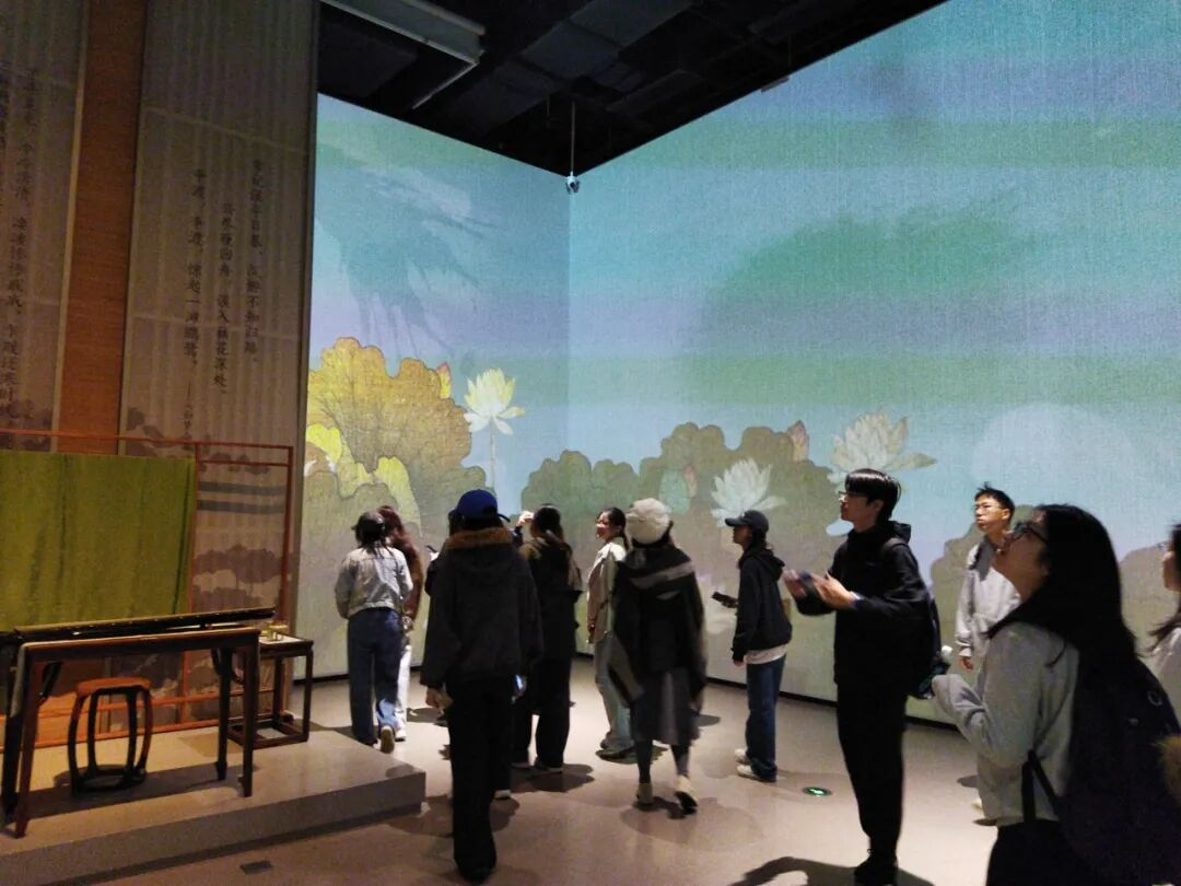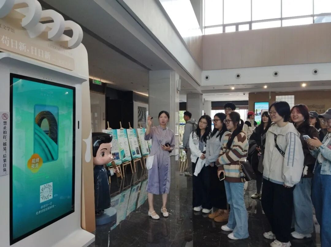 在两位讲解员的引导下,23级翻译专业的同学们有序进入场馆。讲解过程中,讲解员结合展陈内容,生动讲述了浙江文学从吴越时期的源头起步,历经唐宋诗词的兴盛、明清小说的繁荣,再到现当代文学蓬勃发展的漫长历程。