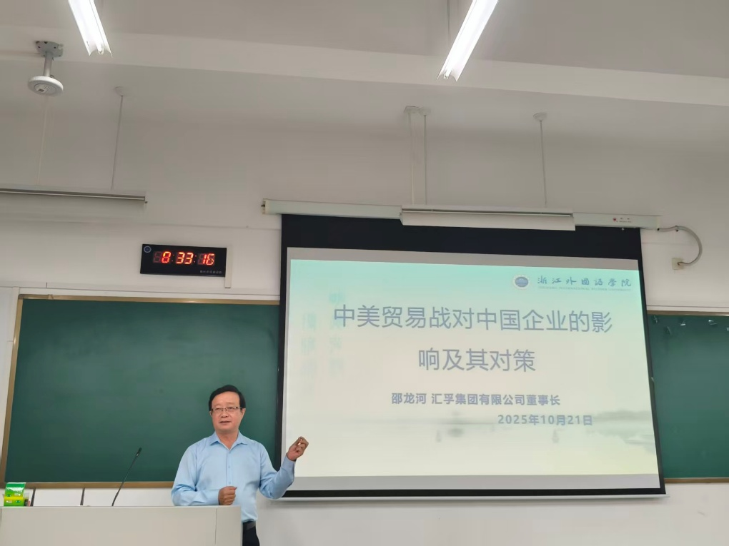 10月21日,汇孚集团有限公司董事长邵龙河先生应邀为英文学院全体23级商务英语、24级国际关系专业学生作题为“中美贸易战对中国企业的影响及其对策”的讲座。区域国别与商务英语系教师何习尧、章珏参加讲座,区域国别与商务英语系教师陆海霞主持。
