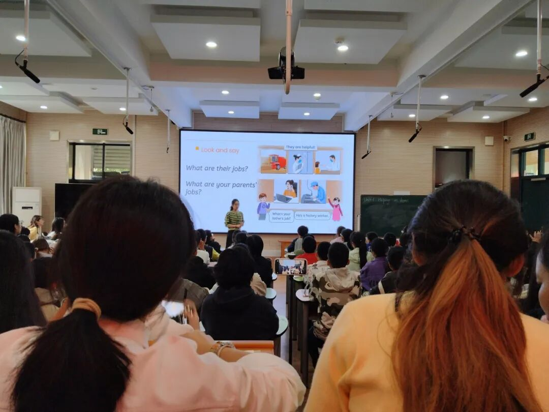 活动现场,四位小学英语教师各展教学风采。杭州市竞舟小学教师李恒楠以“描述朋友”为核心开展词汇教学,先借趣味音乐调动学生情绪,用图片唤醒旧知引出新词汇,让词汇学习与生活场景紧密相连;再通过多样化互动活动,助力学生将抽象词汇转化为具体认知;最后依据学生能力差异设计分层任务,由基础到拓展逐步推进,保障全体学生掌握词汇,达成从“认知”到“运用”的教学目标。