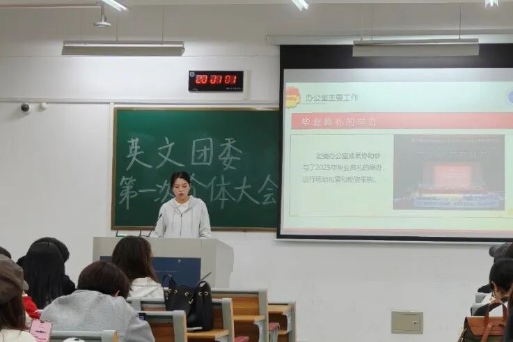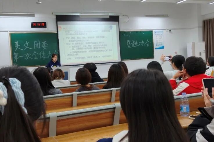 近日,2025-2026学年英文学院团委第一次全体大会暨融冰活动在融B207顺利召开,学院团委副书记(学生)李仪婷主持会议,团委全体成员参加。