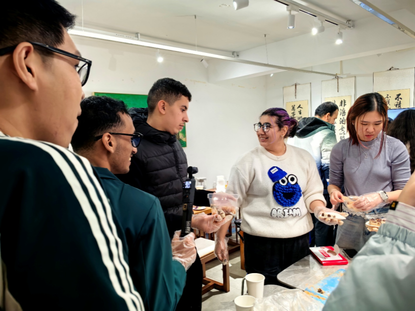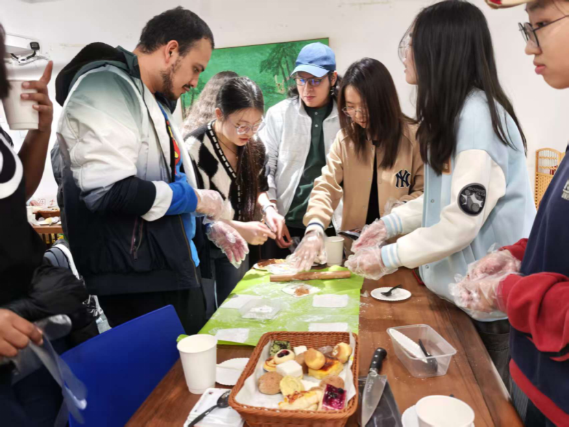体验环节一开始,现场立刻热闹起来。同学们自然地分成几簇围在桌边,双手按上糯米面团,揉搓间反复翻转。用指尖捏取少量黄豆粉撒在案板上,将揉好的面团滚过粉末,粉粒均匀地裹在表面。几位留学生跟着示范动作,认真地捏面团,再慢慢滚动裹粉,一步步复刻操作流程。大家边做边交流,不时分享技巧,欢声笑语中,文化的隔阂悄然消散。
