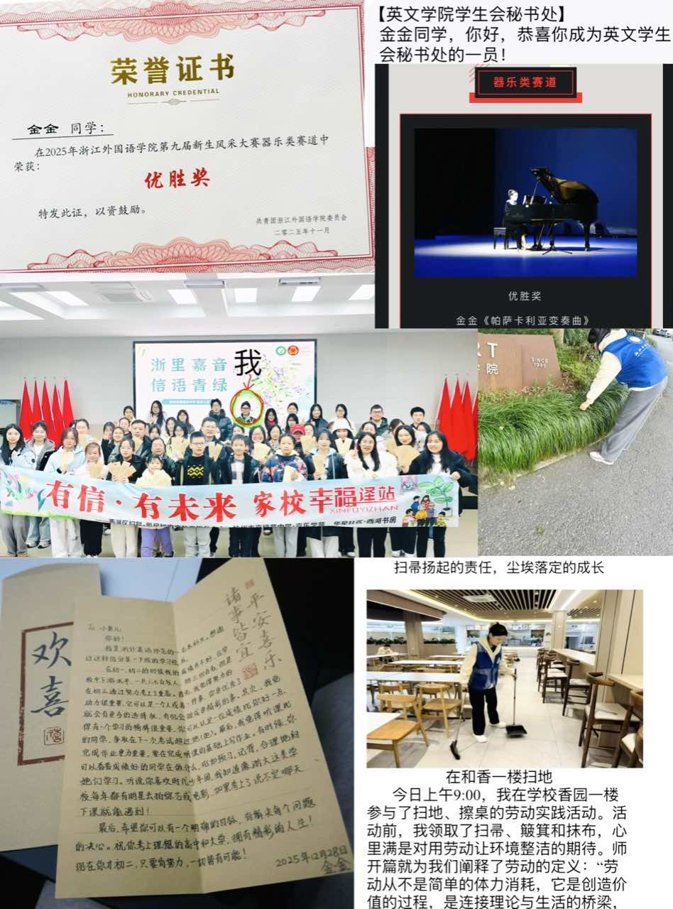 我的2025年关键词是“破界”。在浙江外国语学院的时光里,我用勇气剖开自我设限的壁垒:挣脱“非专业”标签,以《帕萨卡利亚变奏曲》登上新生大赛舞台,让琴声撞碎偏见,收获优胜荣光;叩响校园与社会联结之门,在“浙里嘉音”活动中执笔成长信笺,让感悟跨越年龄,完成温暖传递;躬身投入劳动实践,在食堂晨扫与绿植养护中,触摸劳动温度,打破“重知轻行”的惯性;更撕开“内向慢热”的茧房,走进学生会,从沉默旁观者蜕变为统筹参与者,在实践中拓宽性格边界。