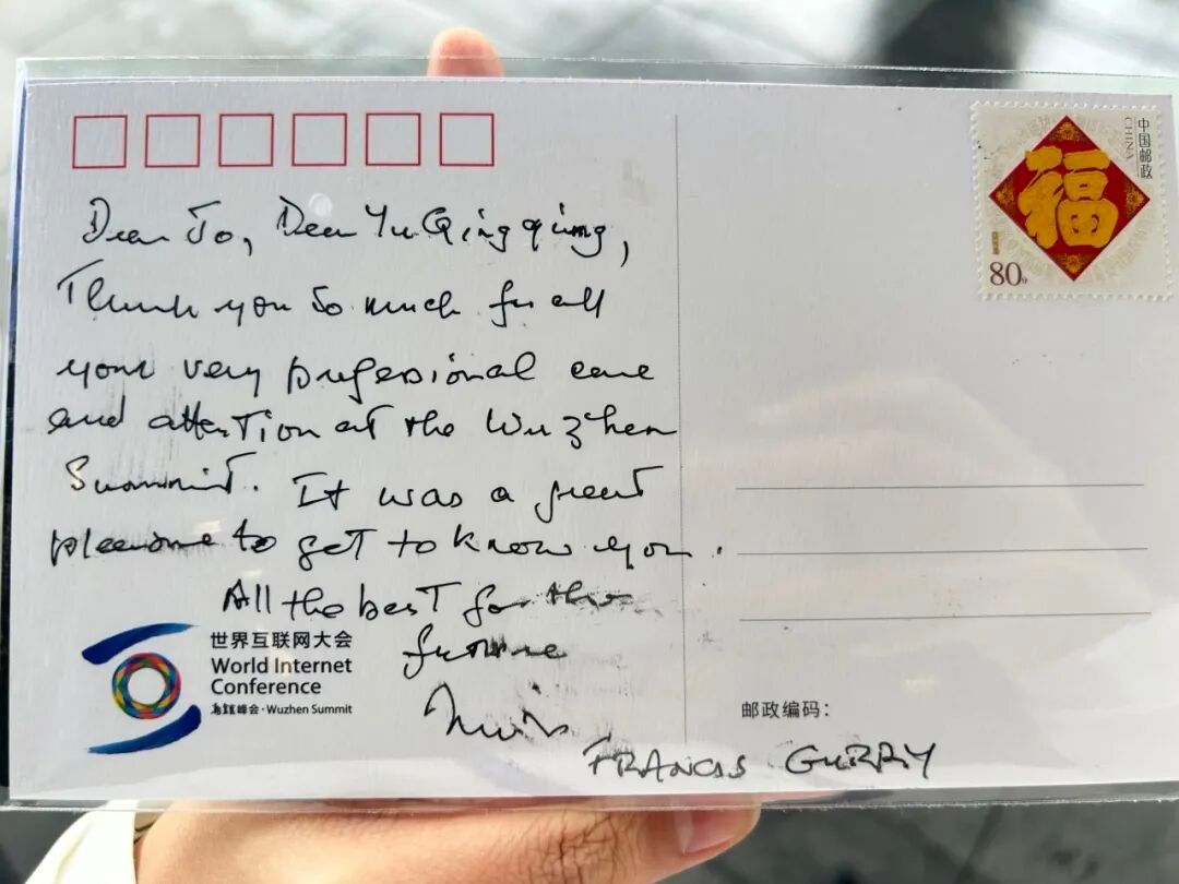 会议期间,23级英语专业的俞青青与联络员保持密切沟通,细致核对嘉宾的每日参会安排,做到提前提醒、及时告知,确保行程顺畅无误。面对嘉宾对江南水乡的好奇,她将历史传说和风俗民情娓娓道来,把一个个文化细节讲得生动有趣,赢得嘉宾频频点头称赞。“四天全程的陪伴参与,更让我在实战中迅速提升了跨文化沟通与协调能力。”俞青青说,“乌镇峰会为我打开了一扇窗,让我得以眺望更为广阔的世界,也让我更加坚定要继续运用自身的语言与跨文化交际能力,服务世界,连接更多元的文化!”