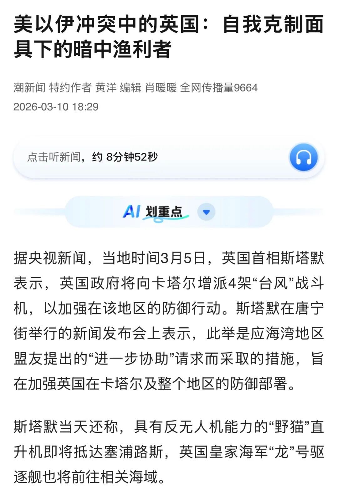 也有观点认为,斯塔默一再拒绝参与美以对伊朗进攻性打击,意味着英国选择置身事外,不愿重蹈伊拉克战争中铁了心追随美国的覆辙。然而,就目前的形势来看,这两种观点恐怕都较为片面,无法准确反映目前英国在此次冲突中的真实考量。