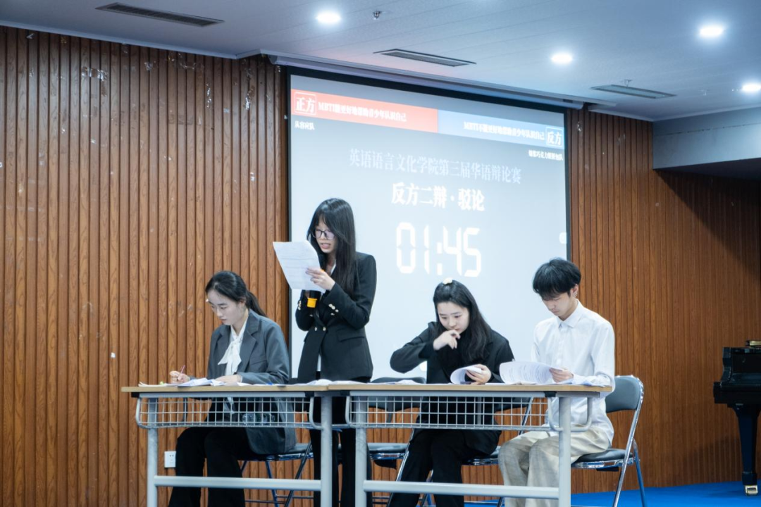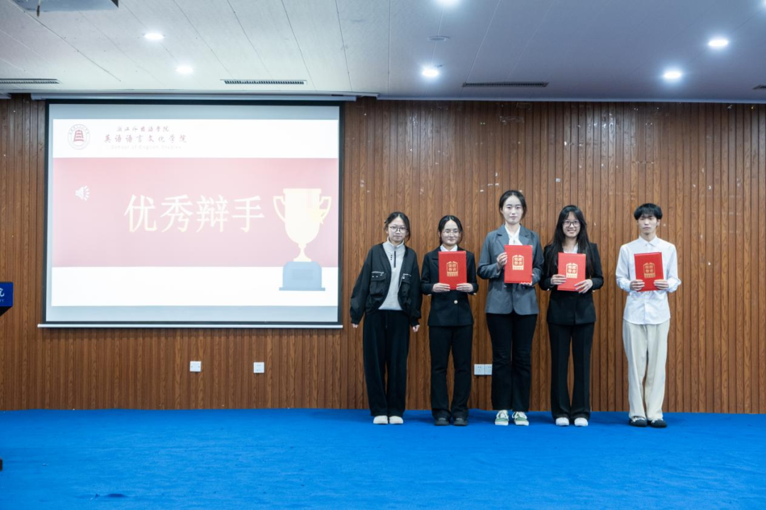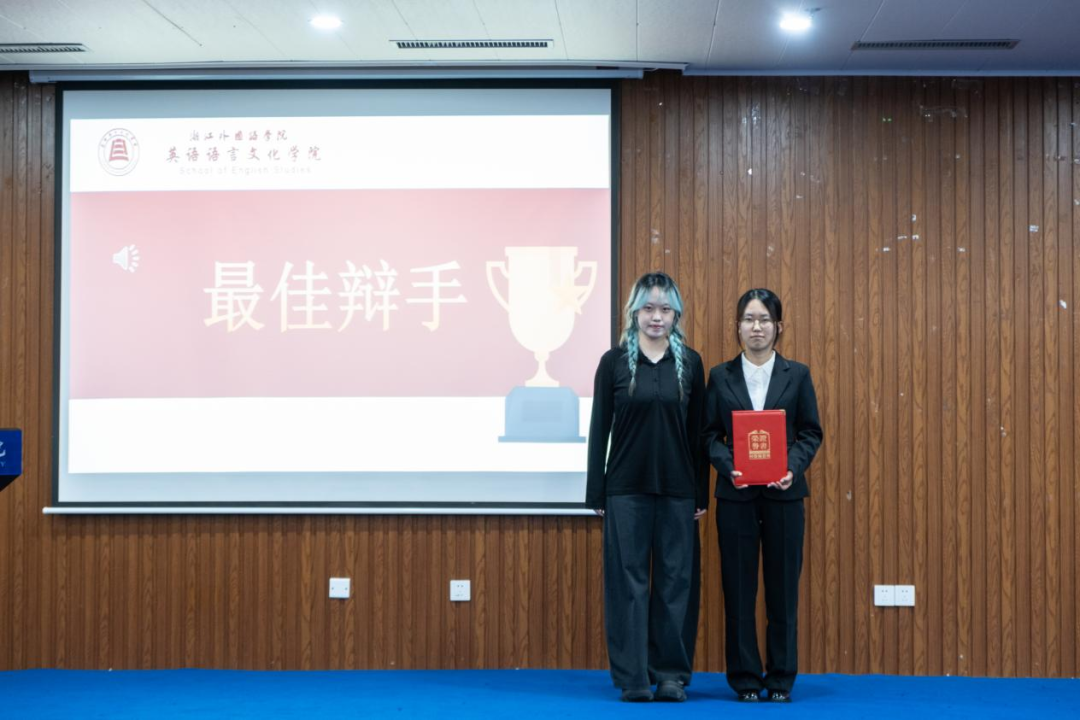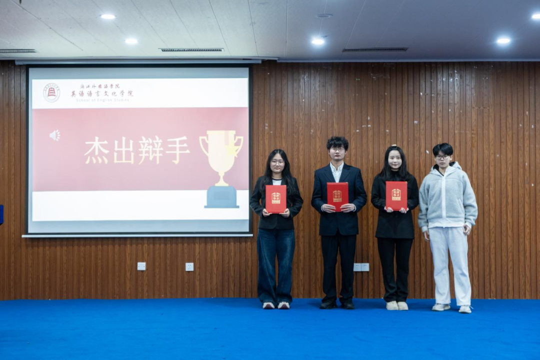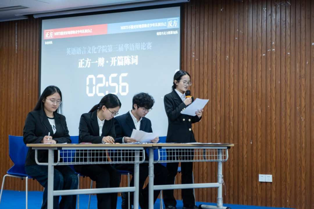 近日,英文学院华语辩论赛决赛于博文堂正式举行。第一届流火杯季军、浙江外国语学院第二十八届辩论赛冠军、小和山三校联赛冠军赵珊;2025年第六届山西高校辩论邀请赛冠军、第四届捭阖杯双院联合辩论赛团体亚军翁文静和浙江外国语学院第二十七届辩论赛亚军、小和山三校联赛冠军、第三届捭阖杯双院联合辩论赛冠军董晓羽担任评委。八位辩手组成两队,就“MBTI能否更好地帮助青少年认识自己”展开激烈辩论。