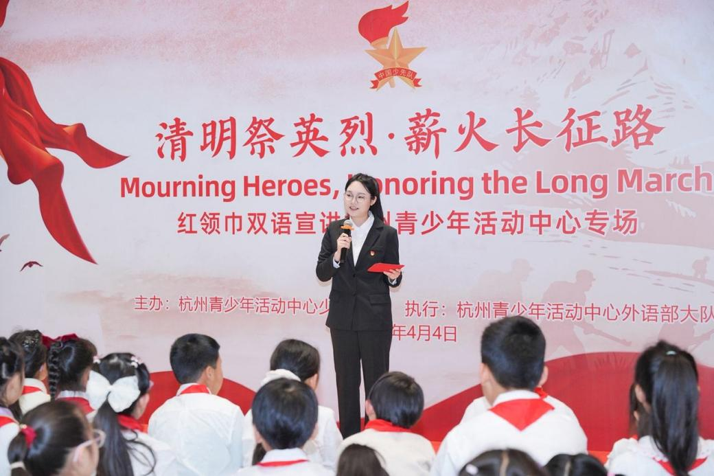 为缅怀革命英烈、弘扬长征精神,英文学院22英语5班应紫依近日积极参与由杭州青少年活动中心少工委主办、外语部大队承办的“清明祭英烈·薪火长征路Mourning Heroes, Honoring the Long March”红领巾双语宣讲主题队日活动,活动获主流媒体潮新闻报道。