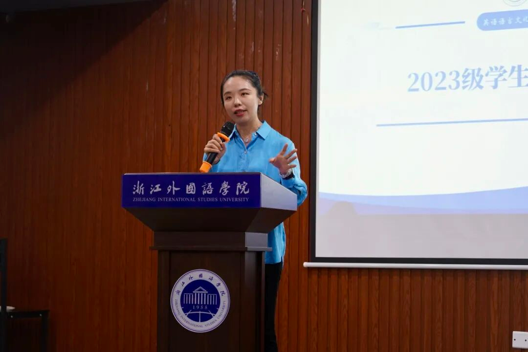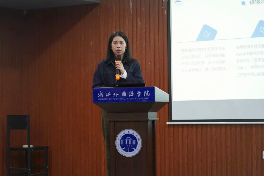 杨沁儿就迎评促建对学风建设与校园管理向2023级学生提出具体要求。她介绍了学院同步推行“清朗学风指数”积分制,促进学风素养和文明礼仪的双重提升,她鼓励同学们尽早进行职业生涯规划,把握出在校期间的机会。