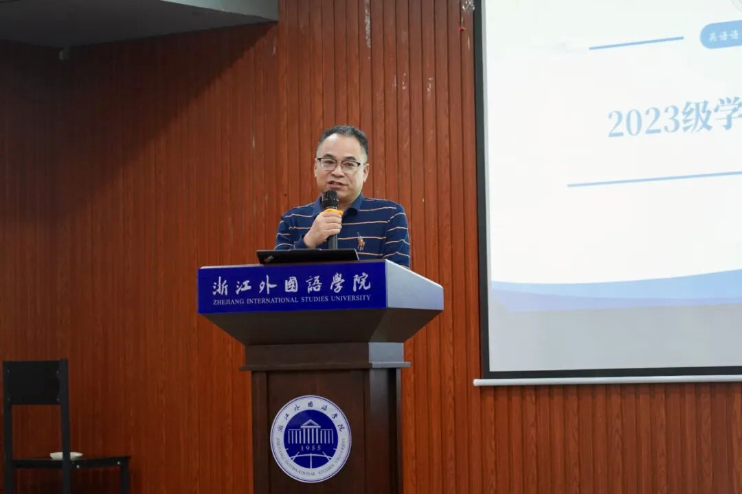 邢富坤在讲话中指出,大家正处于由语言技能向专业方向跃升的关键期,年级大会的召开正是为了帮助大家顺利跨越这一转折点。他强调,年级大会是学院加强学业指导、生涯规划和日常管理教育引导的重要抓手,是加强师生对话、赋能学生发展的创新之举。通过领导班子与专业系对接的运行机制,统一明确课程内容与阶段目标,让每位同学清楚学什么、怎么学、为何学。通过集中讲解与面对面交流,为同学们提供个性化、前瞻性的学业与生涯建议,督促大家确立个人发展方向,提前布局核心专业竞争力。