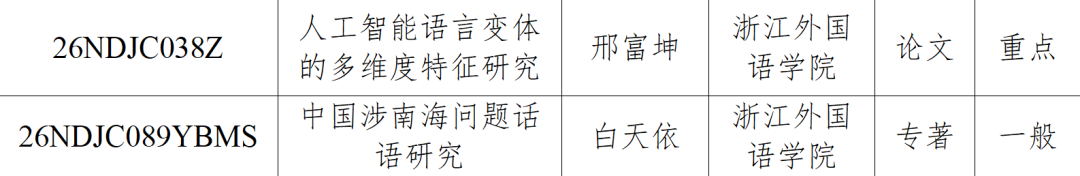近日,经专家评审,省社科联党组研究,省哲学社会科学工作室审批同意,2026年度浙江省哲学社会科学规划课题立项名单公布。英文学院院长邢富坤教授申报的“人工智能语言变体的多维度特征研究”与白天依博士申报的“中国涉南海问题话语研究”项目获批浙江省哲学社会科学规划课题立项。
