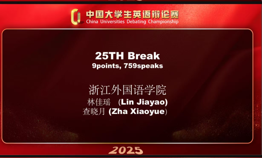 近日,2025CUDC杯中国大学生英语辩论赛全国总决赛落下帷幕。在英文学院楼翎、樊维娜老师的带领下,24级英语(师范)专业林佳瑶与24级英语(师范)专业查晓月以breaking 25的好成绩,获得全国总决赛一等奖,并且晋级下一轮,进入全国32强,争夺冠亚季军的淘汰赛。