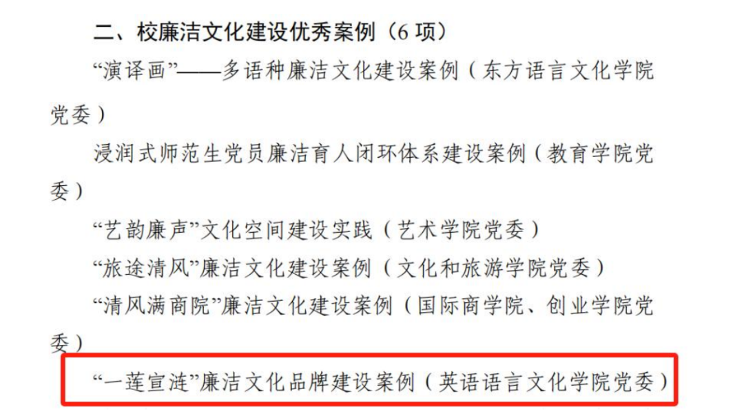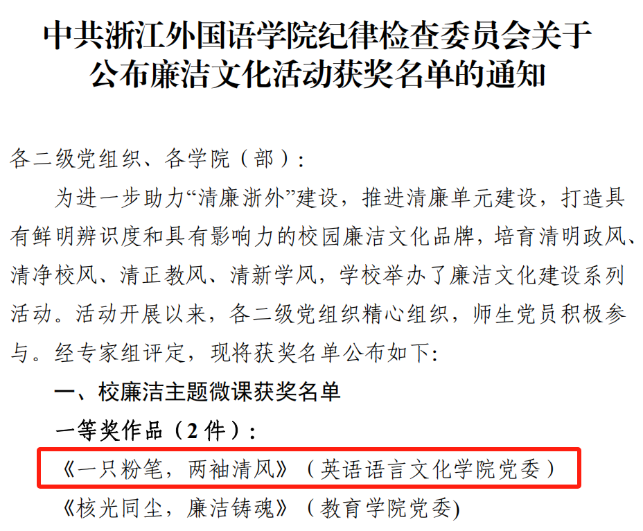 近日,在学校廉洁文化建设系列活动中,由英文学院组织拍摄的《一只粉笔,两袖清风》主题微课获校廉洁主题微课一等奖,“一莲宣涟”廉洁文化品牌建设案例成功入选校廉洁文化建设优秀案例。