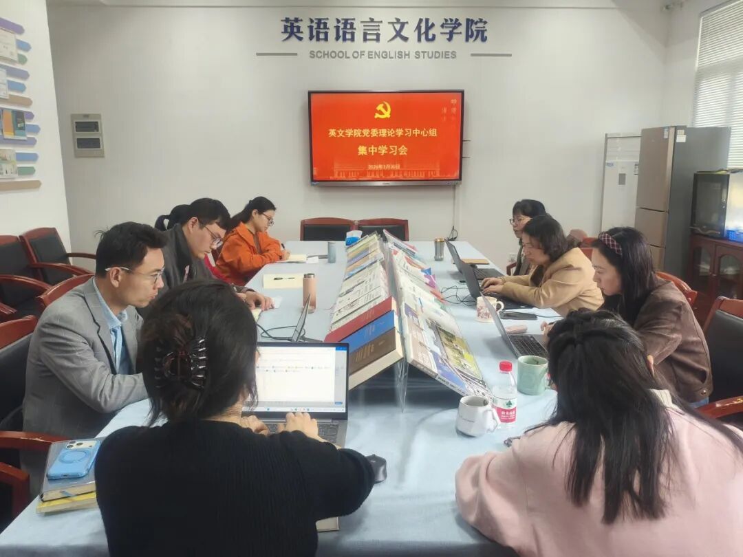 3月30日下午,英文学院召开党委理论学习中心组集中学习会,集中学习2026年全国两会精神、2026年全国教育工作会议精神、《党委(党组)网络意识形态工作责任制实施细则》、习近平总书记在二十届中央纪委五次全会上的讲话精神和2026年浙江省两会精神。学院党委书记郑淑贞主持会议,党委理论学习中心组全体成员参加。