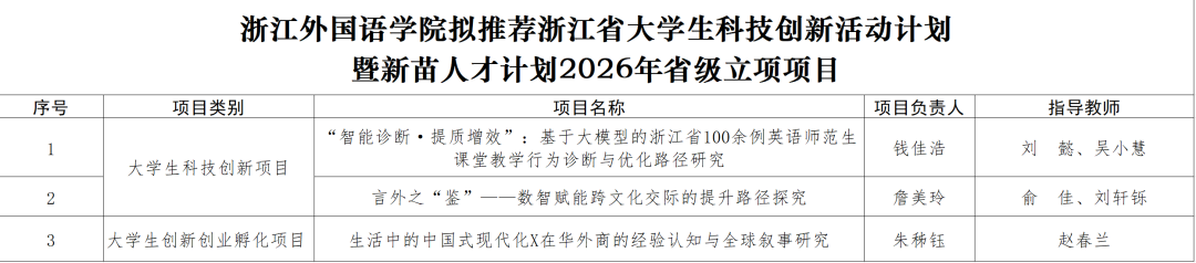 近日,浙江外国语学院2026年拟推荐浙江省大学生科技创新活动计划暨新苗人才计划项目名单正式公布。英文学子在激烈的竞争中脱颖而出,一举斩获3项拟推荐省级立项、2项校级立项的亮眼成绩。这份硕果,不仅是学术能力的证明,更是英文学子澎湃的参赛热情与敢想敢为的实践活力的集中展现。