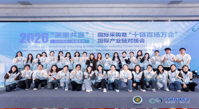 以语言钩织经贸纽带,以志愿践行青春担当。近日,2026“浙里共赢”国际采购暨“十链百场万企”国际产业链对接会在杭州圆满举办。我院八位师生化身中外沟通的桥梁,全程投身会务服务与翻译保障工作,用专业素养、热忱态度展现英文学子独特的青春风采,为这场国际经贸盛会注入新的生机与活力。
