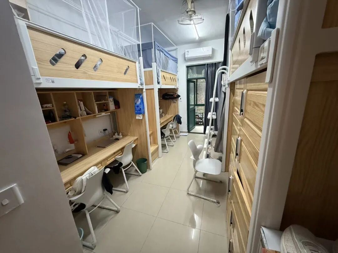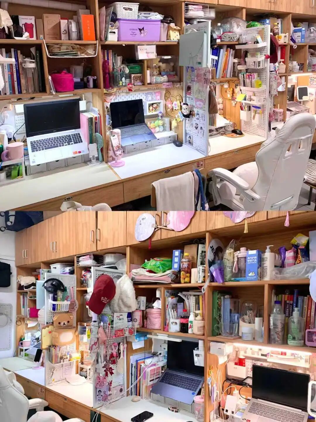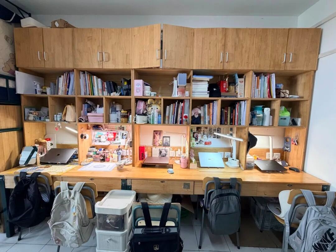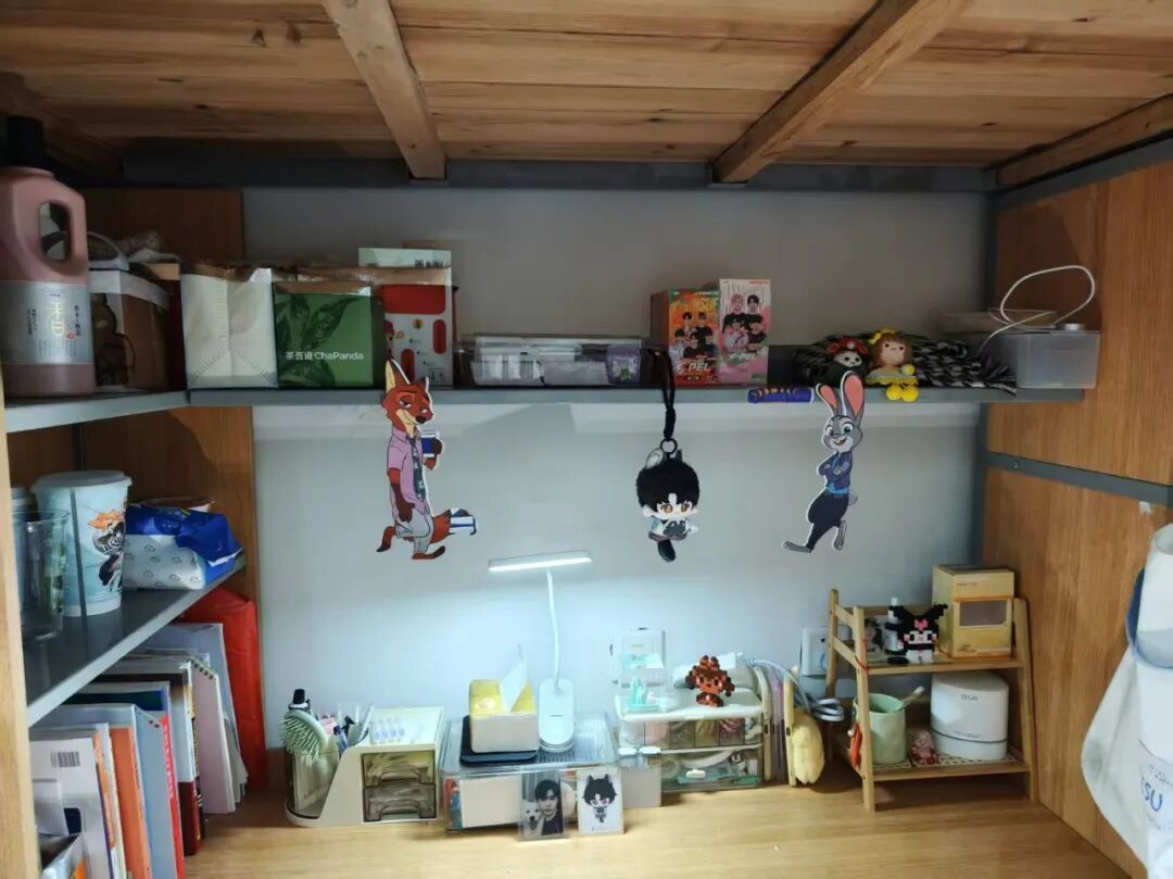 我们走的是简约风。宿舍内物品摆放整齐,地面干爽洁净,屋子宽敞明亮。为了增添生活气息,我们养了些绿植,寝室的女孩们还为宿舍配备了除湿机与香薰机。个人空间内,我们各自用自己喜欢的元素装饰桌面与柜子,让宿舍温馨又舒适。