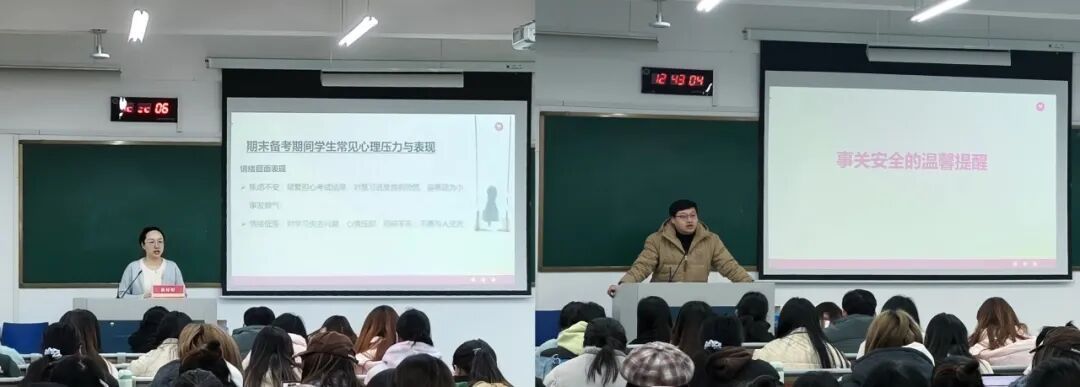 洪妤婷老师重点梳理期末备考常见心理压力,强调心理支持核心在于“倾听与沟通”,需秉持真诚、尊重、共情原则接纳同学情绪,给予正向回应。她分享实用情绪调节方法,明确心理委员与寝室长的“支持者”定位——重点做好困扰发现、主动关怀、基础支持及异常上报工作,兼顾隐私保护与信息畅通,同时提醒大家“先照顾好自己,才能更好帮助他人”。刘轩铄老师为大家送上了一份“安全温馨提醒”,叮嘱同学们离校购票、行程途中提高防范意识,筑牢假期安全防线。
