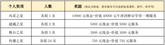 全国阶段/中外青少年展演奖项:所有参与的选手将被授予“中国故事精彩讲述者”称号,并用个人奖项做差异区分排名第1、排名第2~3、排名第4~6以及排名第7~30名的选手。
