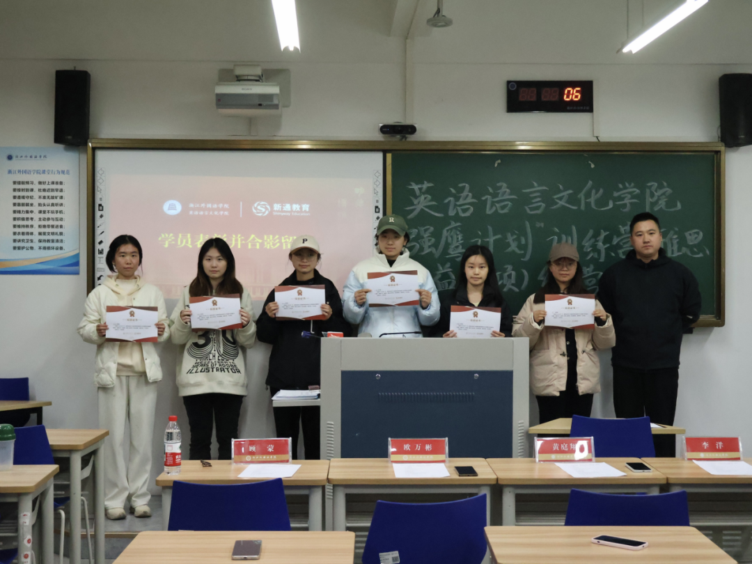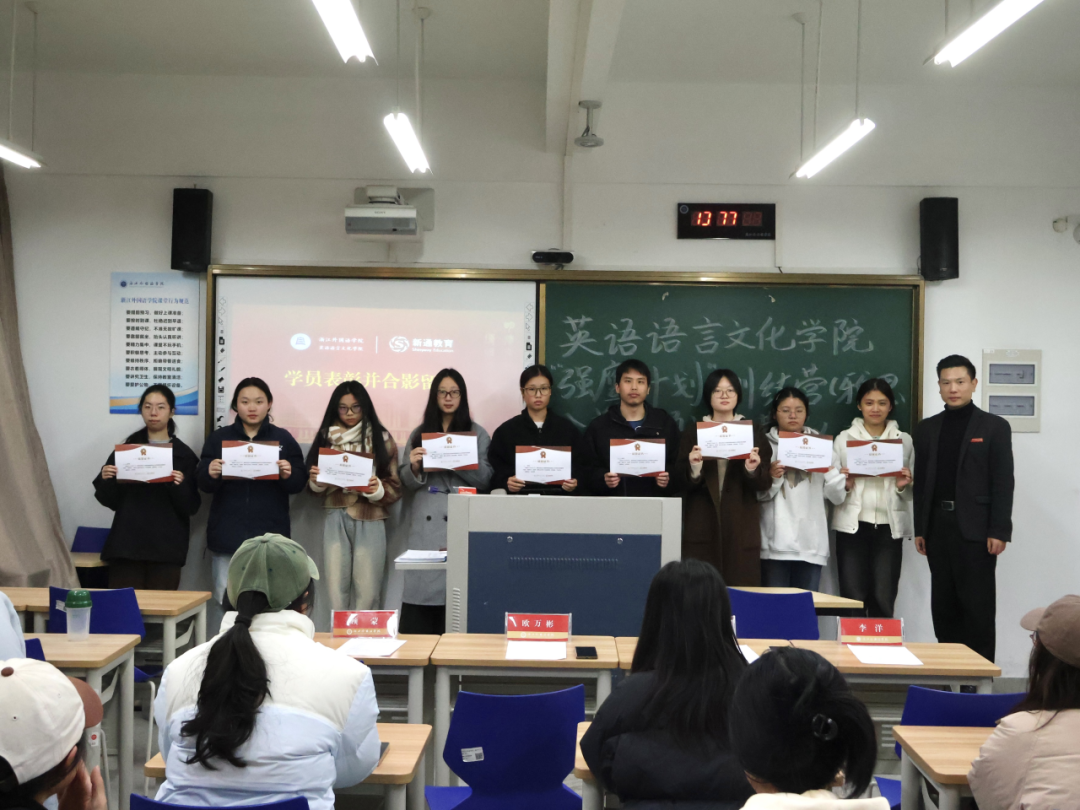 11月27日晚,英文学院“强鹰计划”训练营(雅思公益专项)结营仪式在融B104举行。新通教育杭州外语高校市场总监黄庭翔、市场代表李洋受邀出席,英文学院党委副书记、纪委书记欧万彬,2026届就业负责人吴小慧及全体训练营成员共同参与,学工办负责人顾蒙主持。