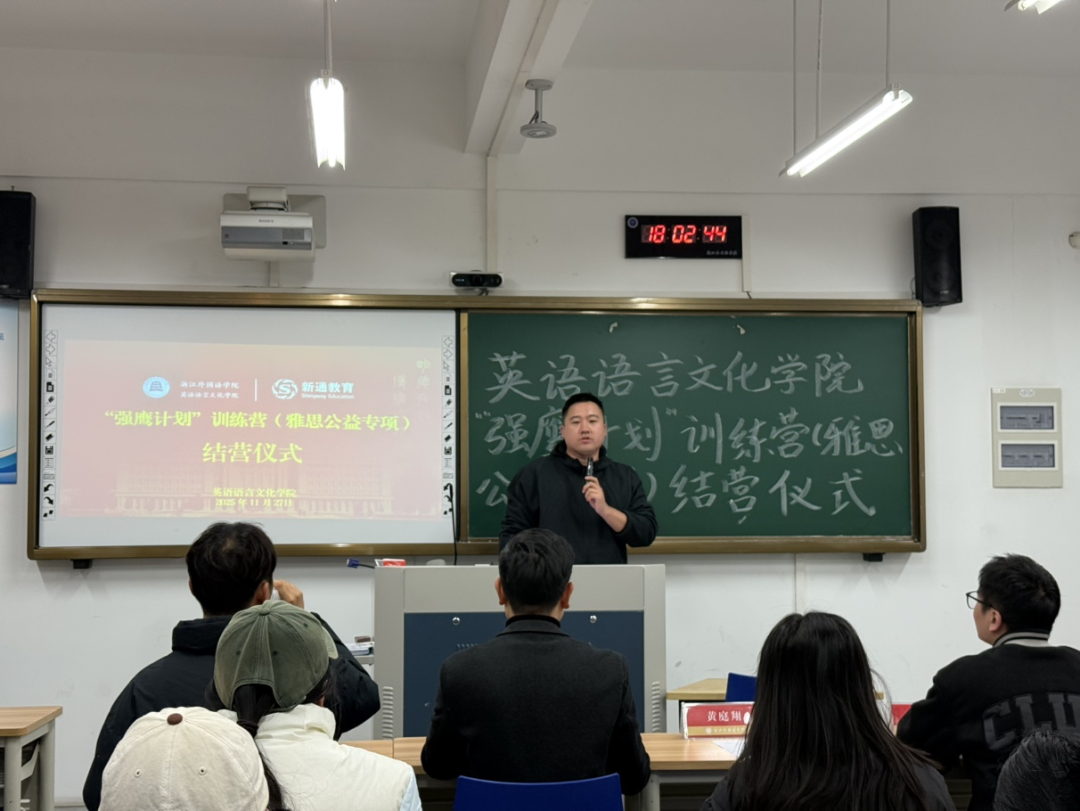 黄庭翔代表新通教育集团作总结发言,他对同学们全程踊跃参与的热情表示认可,尤其欣慰于学生在口语表达、写作逻辑等方面的显著进步。他指出首次与学院联合开展雅思公益训练营便圆满落地,印证了双方“协同育人”的共识,新通教育将持续深耕教育领域,期待与学院拓展更多合作。对于英语专业学子而言,扎实的英语能力能打开更多就业窗口,希望同学们结营后仍保持学习热情。