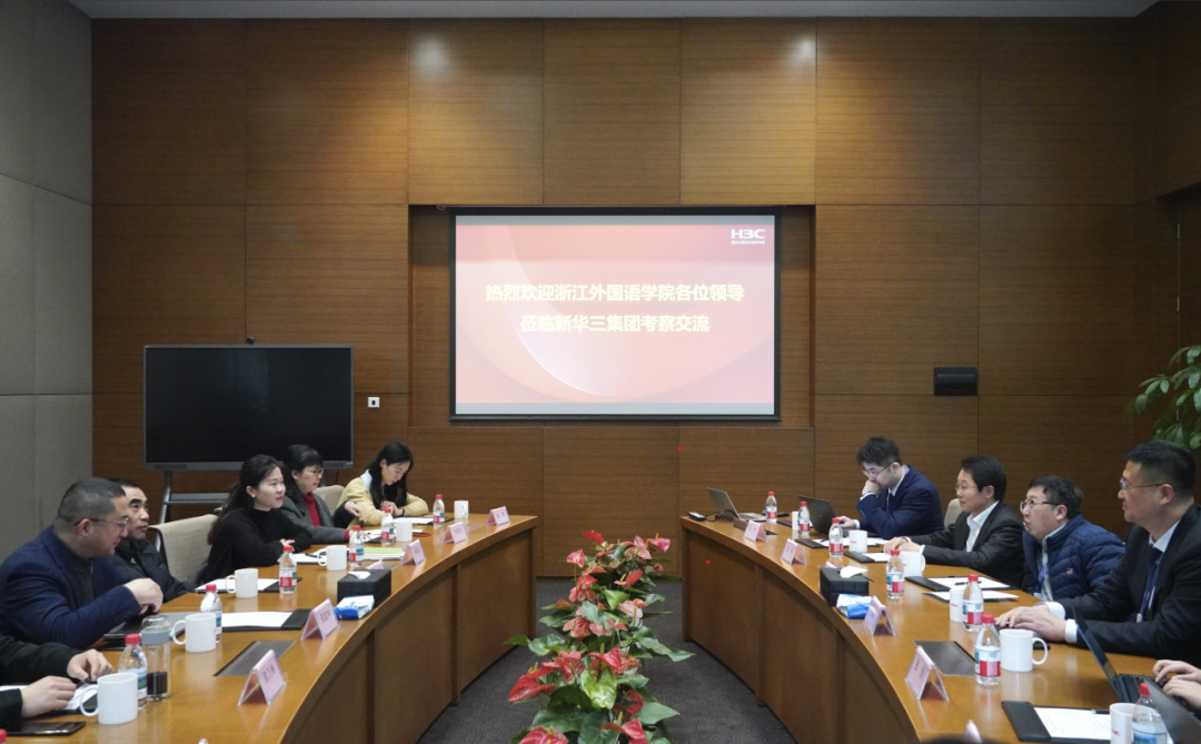 为深入贯彻落实中央经济工作会议精神和教育部“优企引才”专项行动要求,进一步深化校企合作、拓宽毕业生就业渠道,1月28日上午,浙江外国语学院英语语言文化学院赴新华三集团开展访企拓岗促就业专项交流活动。浙江外国语学院党委副书记严齐斌带队走访,学工部部长、英语语言文化学院党委书记田俊杰等参加调研。新华三集团人力资源部供应链与支撑体系干部部总经理葛立海、总裁办客户支持部总经理刘庭军、浙江代表处教育销售部部长刘兵等企业负责人参与接待并座谈。