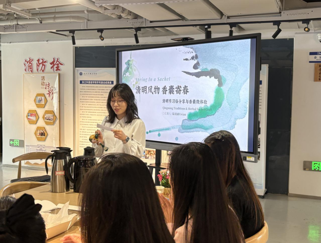 近日,英文学院“理解当代中国·知行活力浙江”跨文化交际时光活动第二十一期如期举行。24英师3班陆羽涵同学以“清明风物,香囊寄春”为主题,与来自俄罗斯、秘鲁等国家的留学生及英文学院学生共赴一场清明文化之约,在习俗分享、哲思对话与香囊手作的沉浸式体验中,解锁传统节气的文化密码,感受中华民俗的独特魅力。
