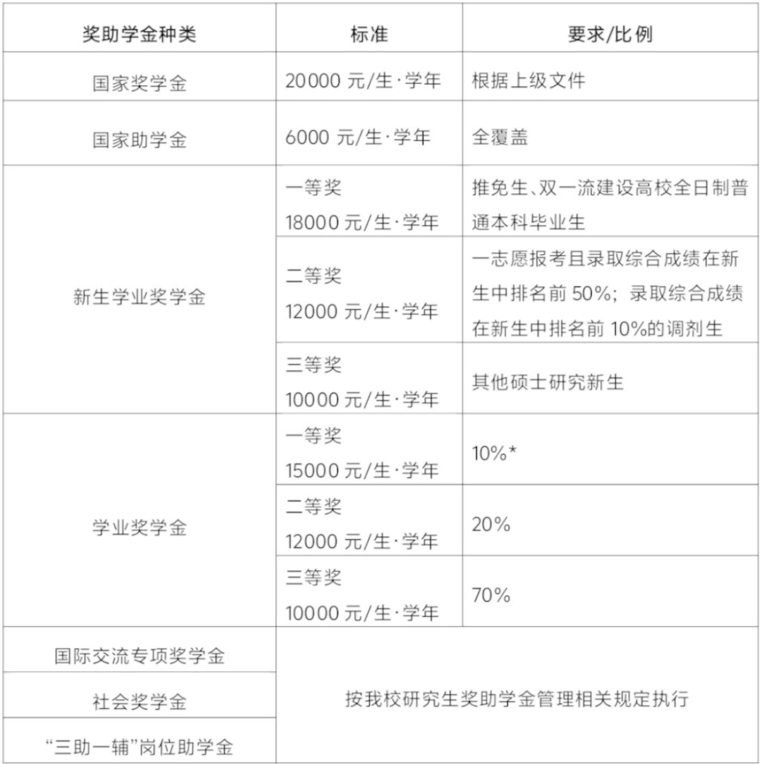 为激励研究生潜心向学,更好地支持研究生顺利完成学业,学校设有各类奖助学金(包括国家奖学金、国家助学金、新生奖学金、学业奖学金、国际交流专项奖学金、社会奖学金),同时设置有研究生“三助一辅”岗位,提供“三助一辅”岗位助学金。家庭经济困难研究生还可以通过申请助学贷款、经济困难补助等方式得到资助。以上各项奖助政策的详细内容和申请条件以我校正式文件为准。
