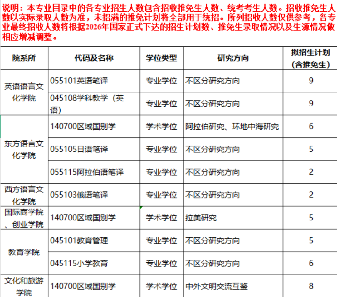 学校学科专业特色鲜明,办学综合实力较强,逐步形成以区域国别学为引领、以外国语言文学为基础、以教育学、工商管理学、中国语言文学、应用经济学等为支撑的学科体系。2026年我校全日制硕士研究生招生覆盖区域国别学1个一级学科以及翻译、教育2个专业学位类别。