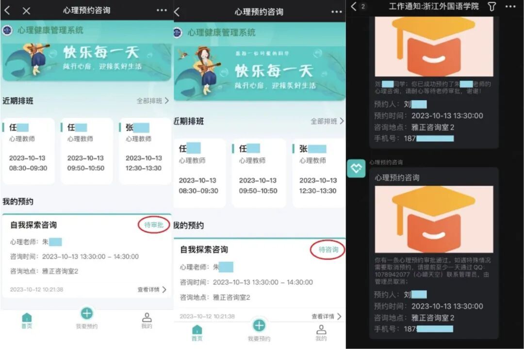 第五步,提交,提交后会有钉钉通知提醒,进入待审核阶段,管理员通过后,进入待咨询阶段,此时预约就成功啦。