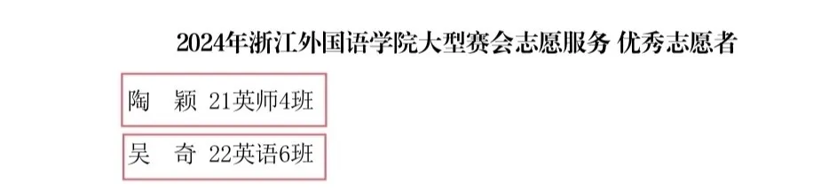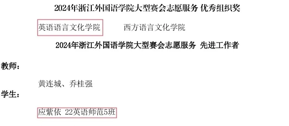 近日,英文学院获评2024年度学校大型赛会志愿服务优秀组织奖,22英语师范5班应紫依获评先进工作者,21英语师范4班陶颖、22英语6班吴奇获评优秀志愿者。
